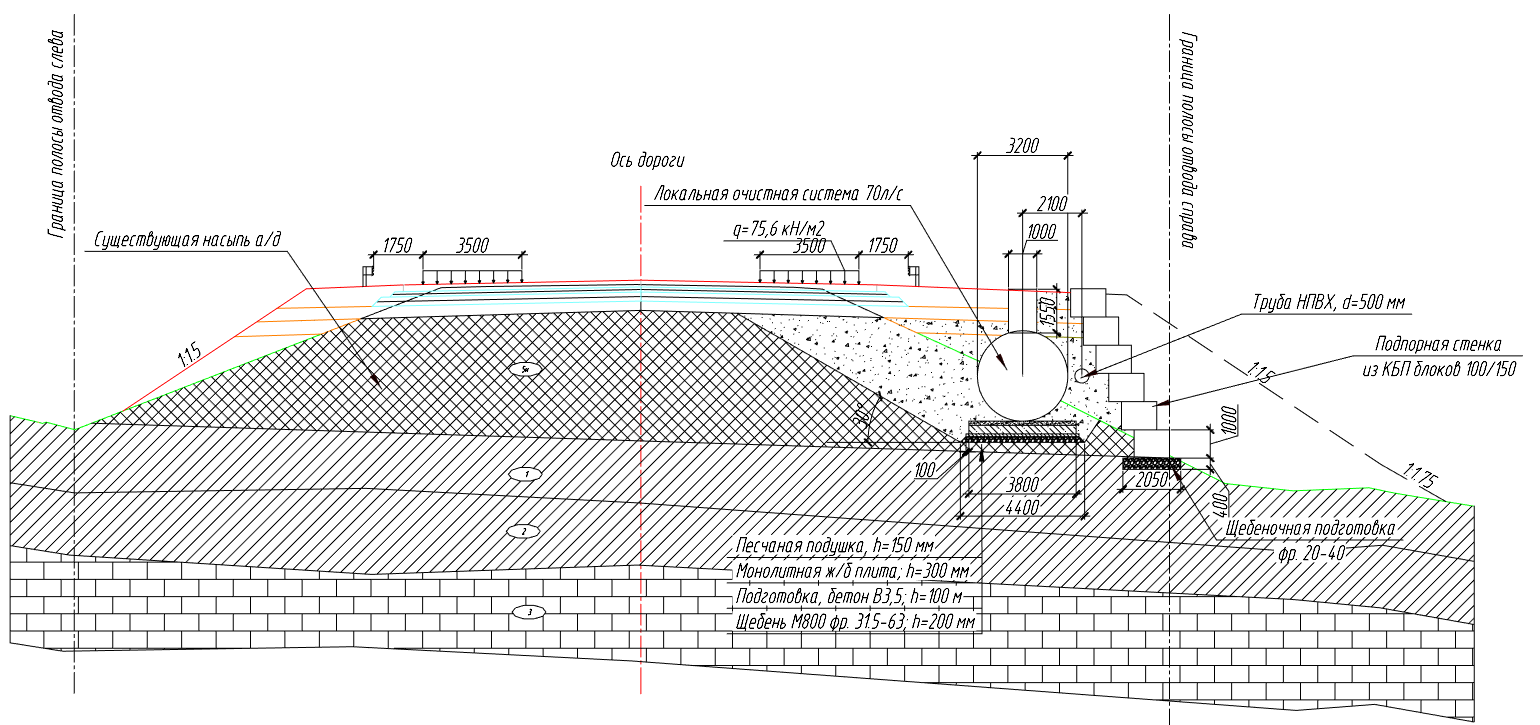 Проектом капитального ремонта моста была предусмотрена установка локальных очистных сооружений перед мостом в количестве 4 штук. Однако из-за ограниченного пространства полосы отвода потребовалось разработать и обосновать техническое решение по монтажу локальных очистных сооружений в земляное полото автомобильной дороги.