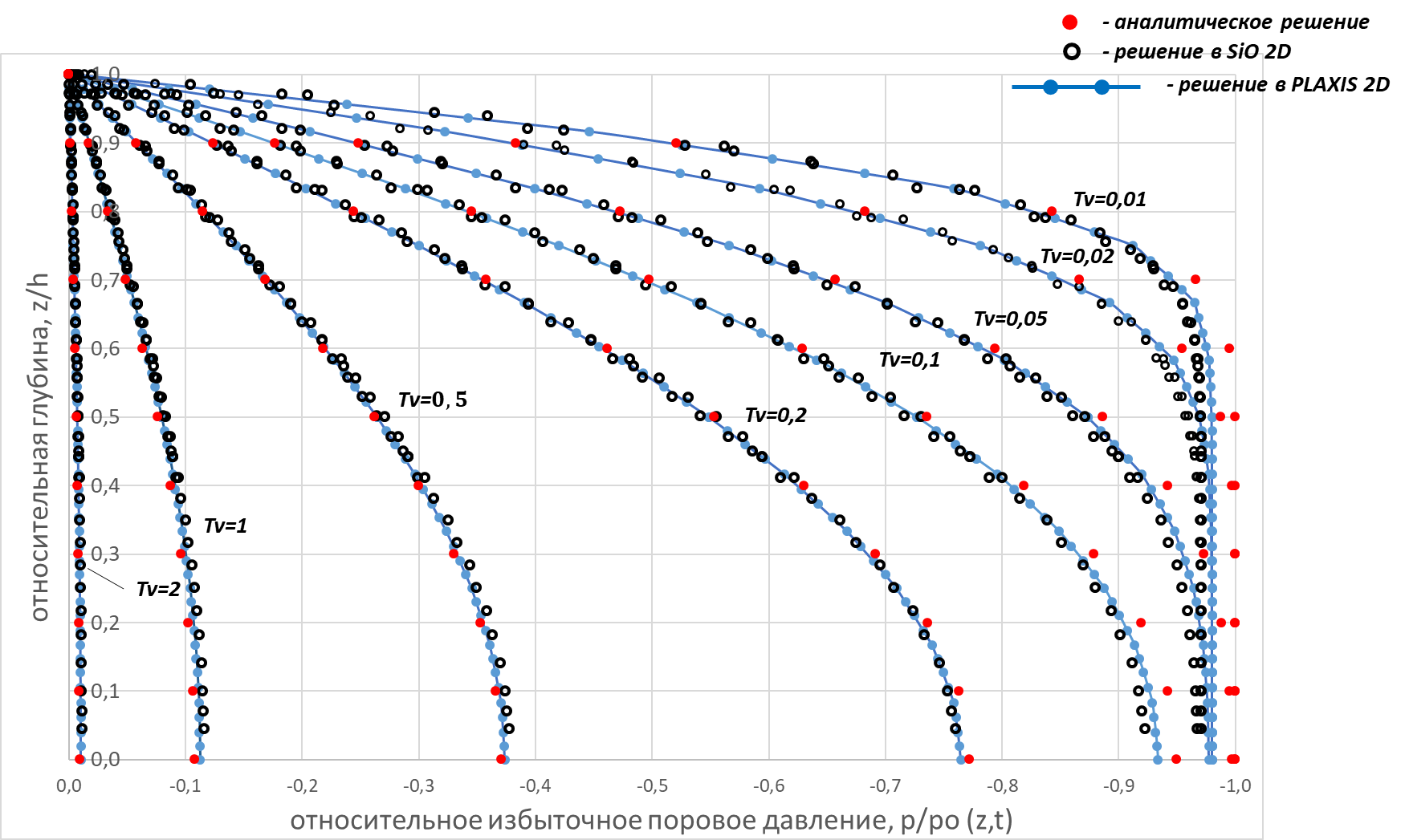 Развитие относительного избыточного порового давления p/p0 во времени (Тv) и в зависимости от глубины (z/H), полученное в SiO 2D и аналитически