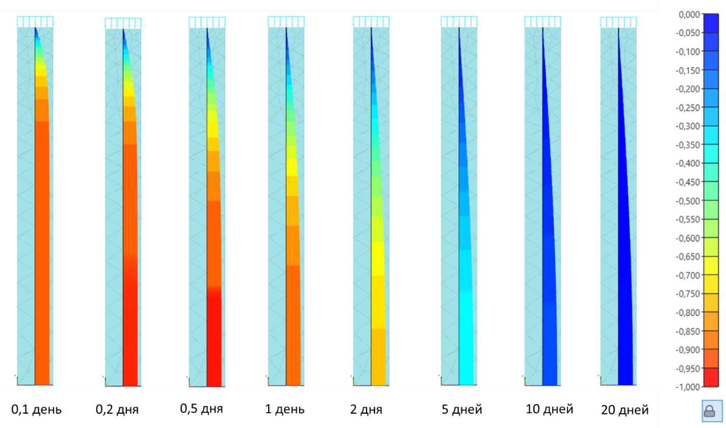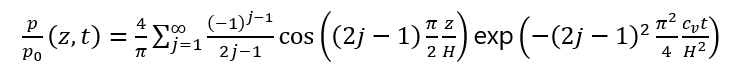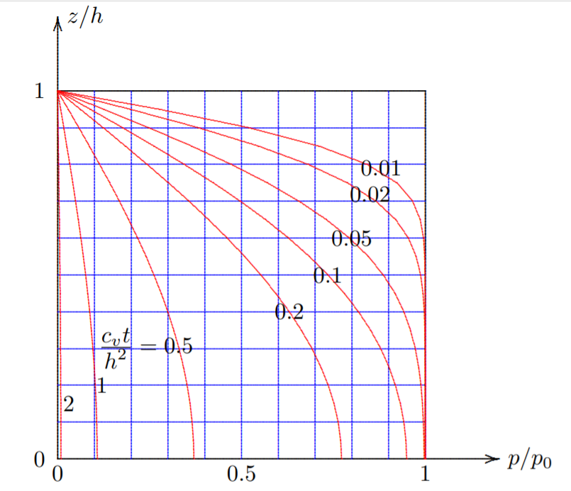 Аналитическое решение этого уравнения в виде относительного избыточного порового давления p⁄p_0 как функции времени t и глубины z дано в работе Verruijt (2001):